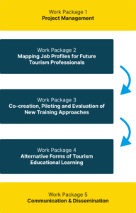 | - Projektets Metode | WP1 – Project Management WP2 – Mapping Job Profiles for Future Tourism Professionals WP3 – Co‑creation, Piloting and Evaluation of New Training Approaches WP4 – Alternative Forms of Tourism Educational Learning WP5 – Communication & Dissemination |